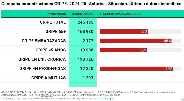 El Servicio de Salud del Principado (Sespa) ha vacunado frente a la gripe a 246.185 personas de los colectivos de riesgo desde el inicio de la campaña estacional, el pasado 30 de septiembre. De ellas, 12.320 personas viven en residencias y 163.980 son mayores de 65 años, con lo que la cobertura de estos grupos de población diana alcanza, respectivamente, el 90,2 y el 59,2 por ciento.