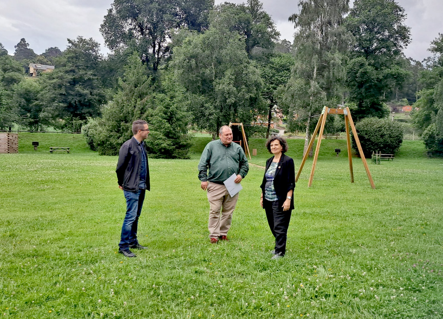 El gerente de la Asociación de Comerciantes de Vegadeo, José Antonio Pasarón; el alcalde de Vegadeo, César Álvarez, y la consejera de Cultura, Política Llingüística y Turismo, Berta Piñán, en uno de los puntos por los que transcurrirá la nueva sensa peatonal entre A Veiga / Vegadeo y Piantón (de izqda. a dcha.)