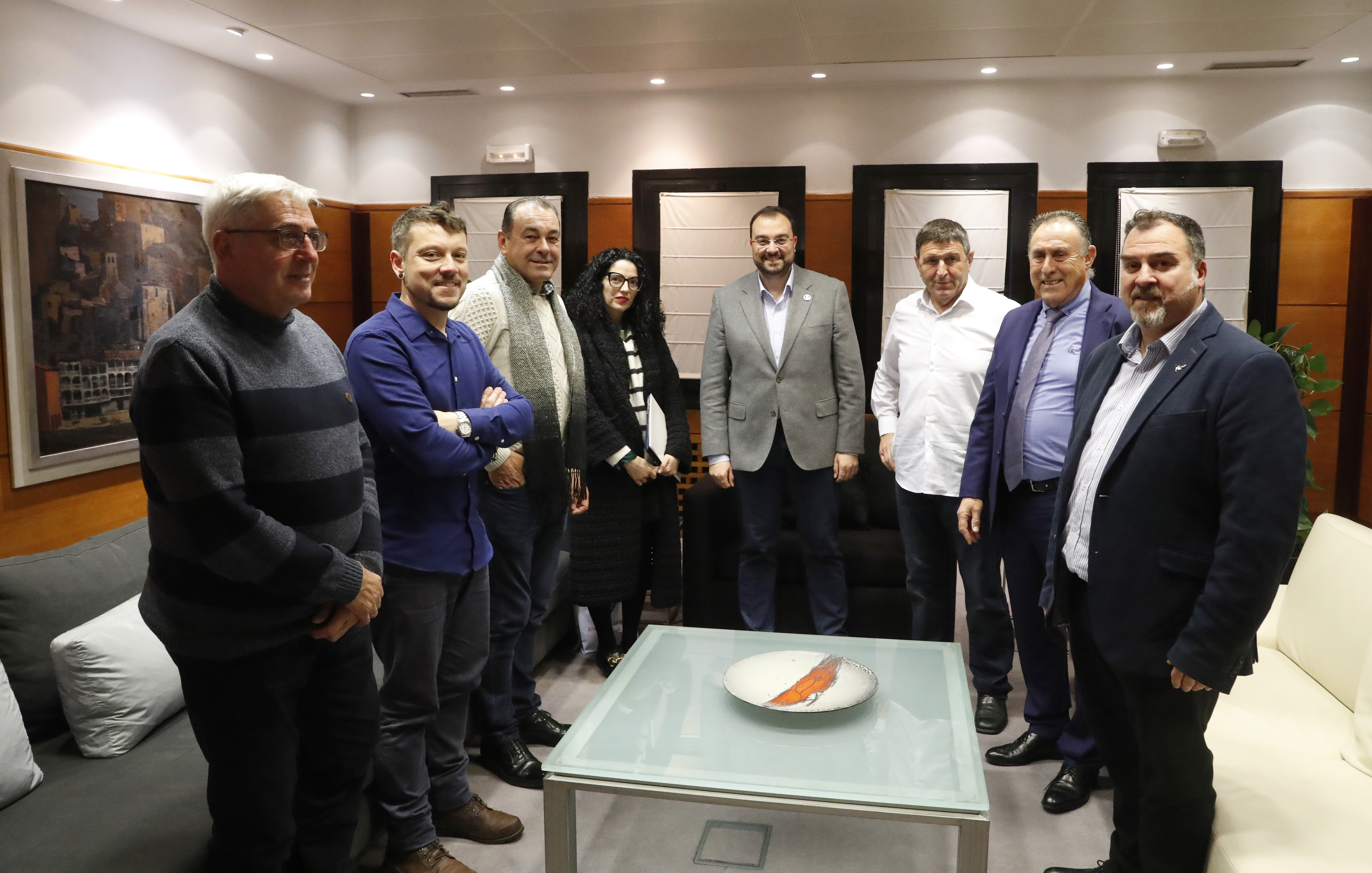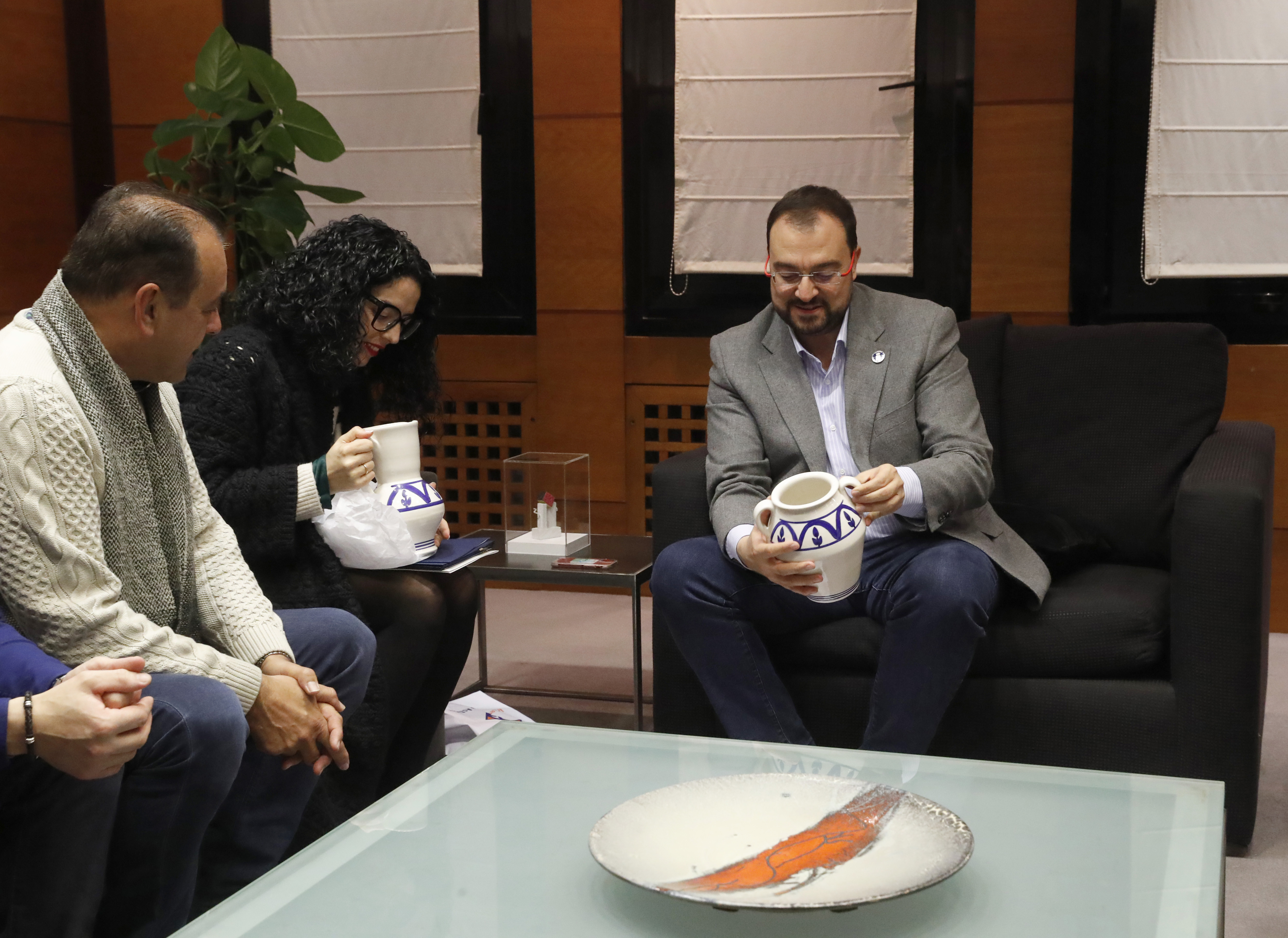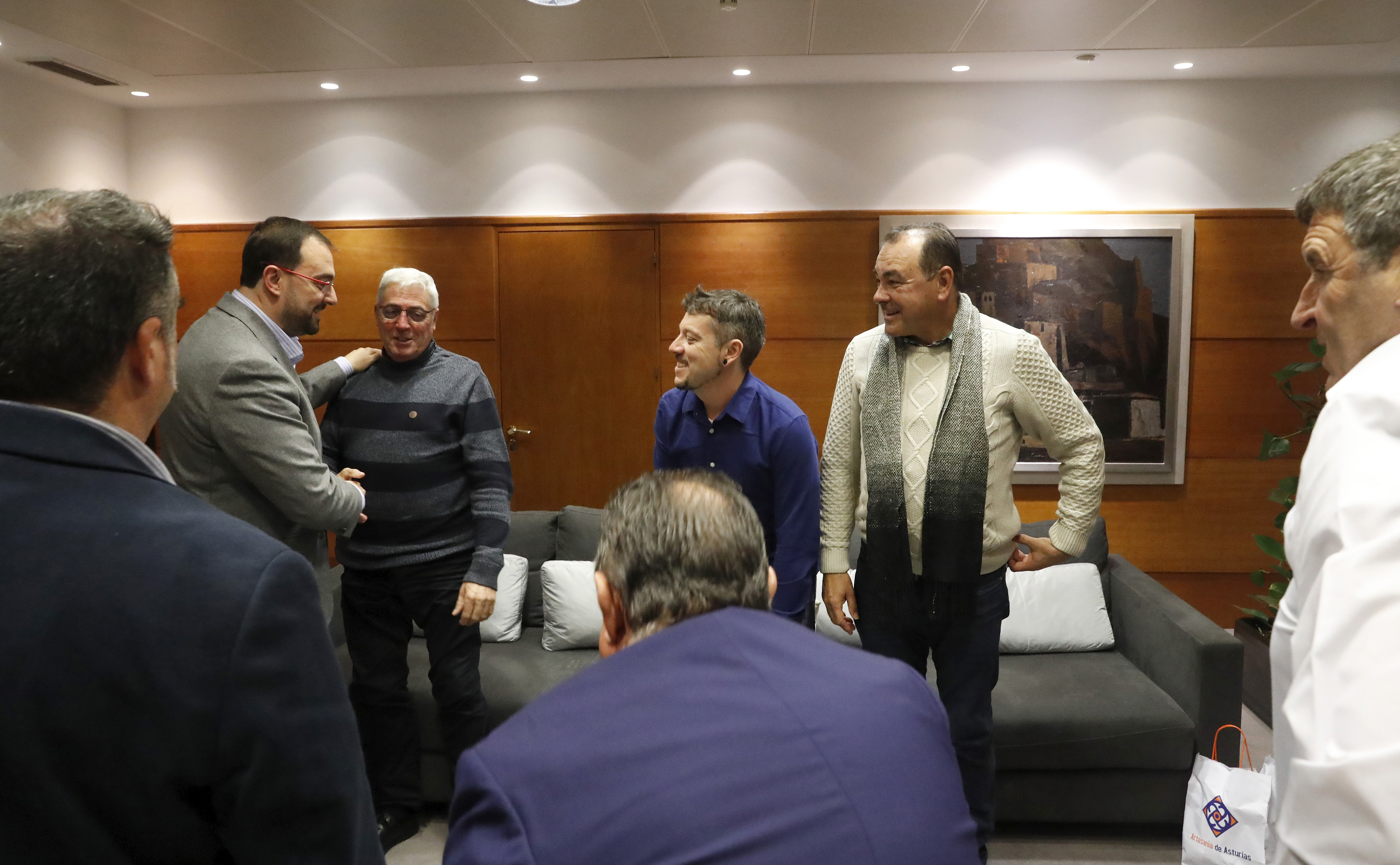 El presidente del Principado de Asturias, Adrián Barbón (en el centro de la imagen), recibe a los representantes de la Asociación de Folclore Amigos de la Tradición (Afatra). A su derecha, la viceconsejera de Cultura, Política Llingüística y Deporte, Vanessa Gutiérrez.