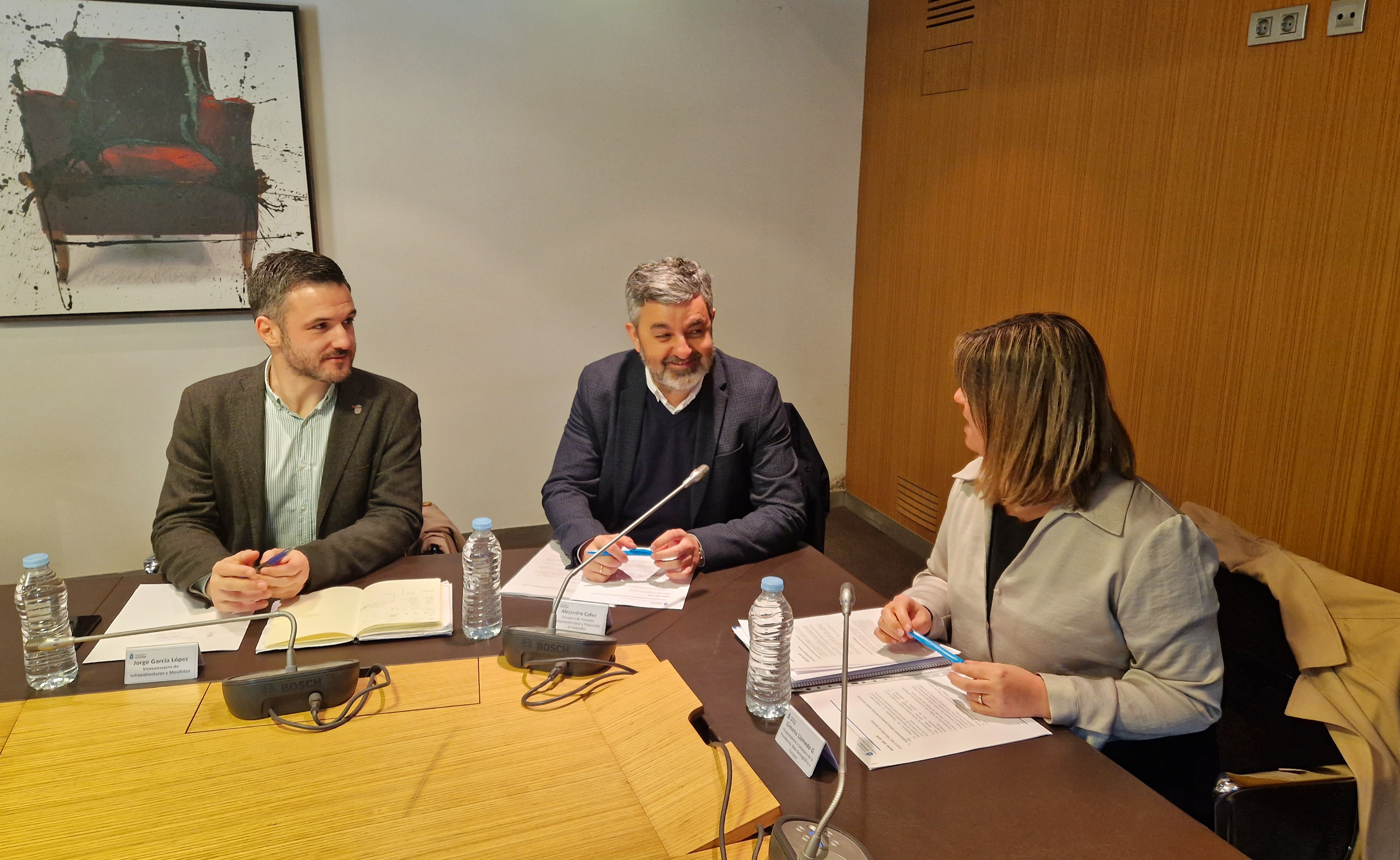 En la imagen, de izquierda a derecha, el viceconsjero de Infraestructuras y Movilidad, Jorge García; el consejero de Fomento, Cooperación Local y Prevención de Incendios, Alejandro Calvo, y la vicepresidenta y consejera de Presidencia, Reto Demográfico, Igualdad y Turismo, Gimena Llamedo.