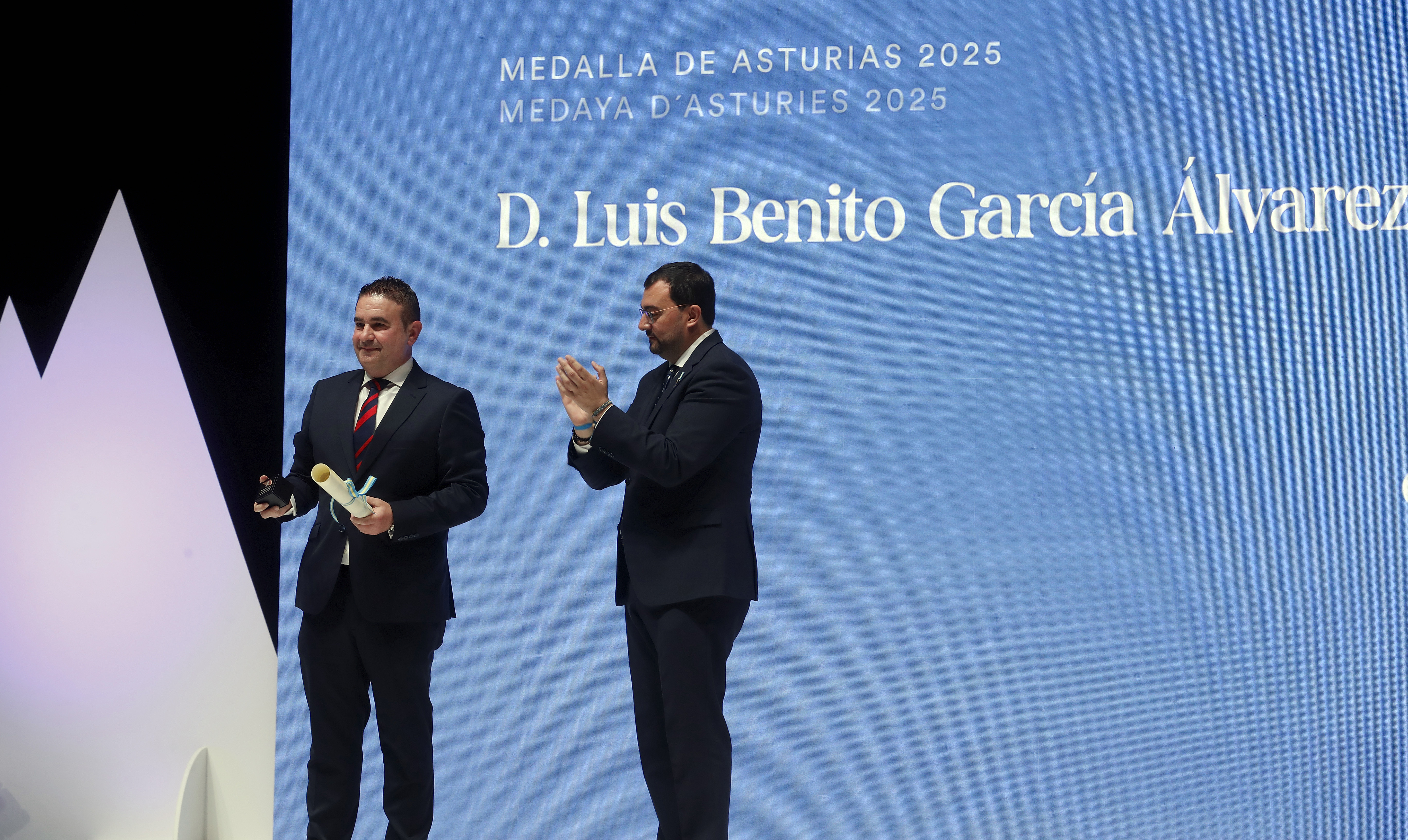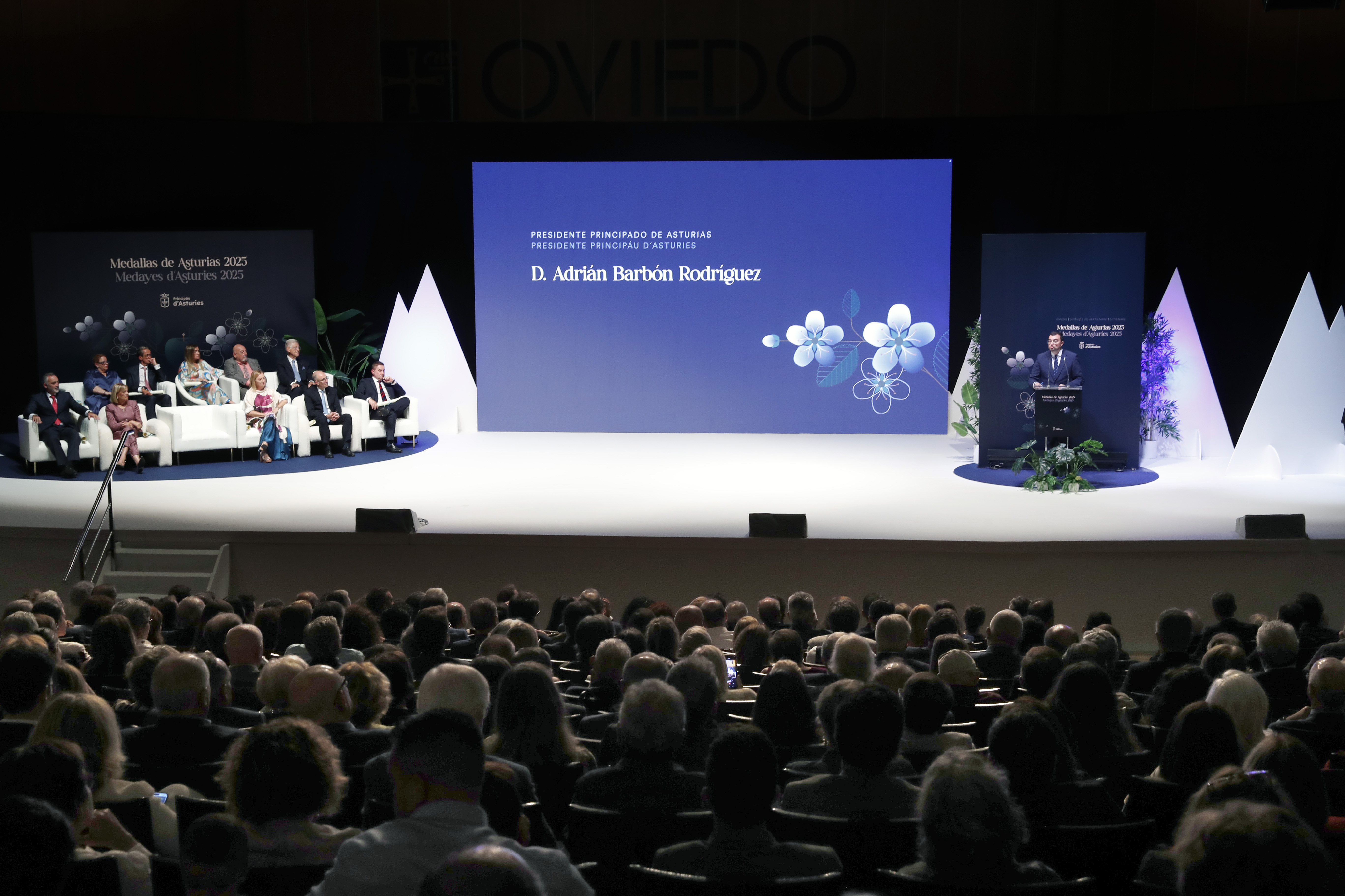 El presidente del Principado, Adrián Barbón, hace entrega del premio a Consuelo Busto, concedido a título póstumo, a su hijo, Verísimo Busto.