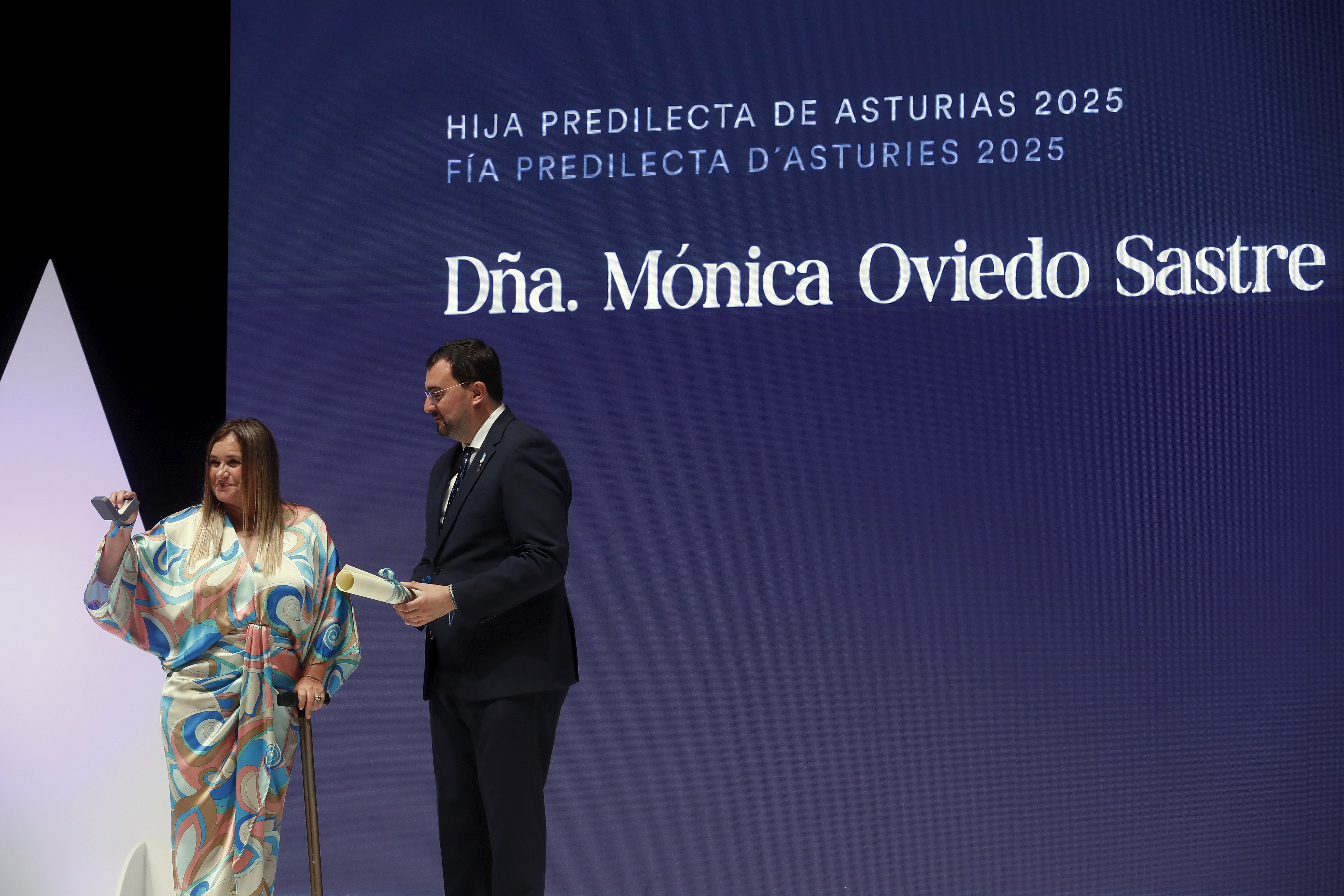 La viuda del presidente Antonio Trevin, Luisa Fernanda Lledías, recoge el galardón de manos del presidente del Principado, Adrián Barbón.