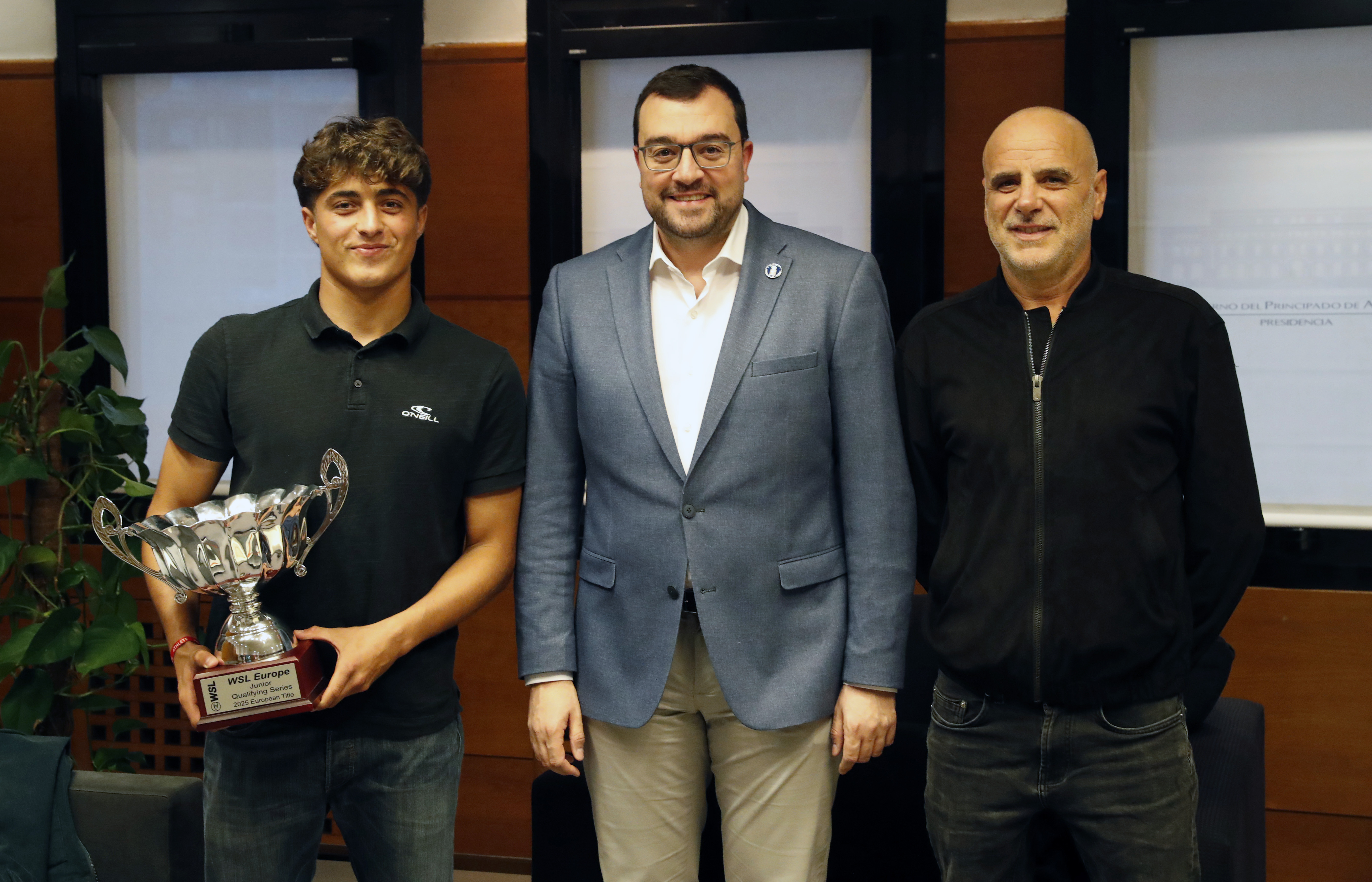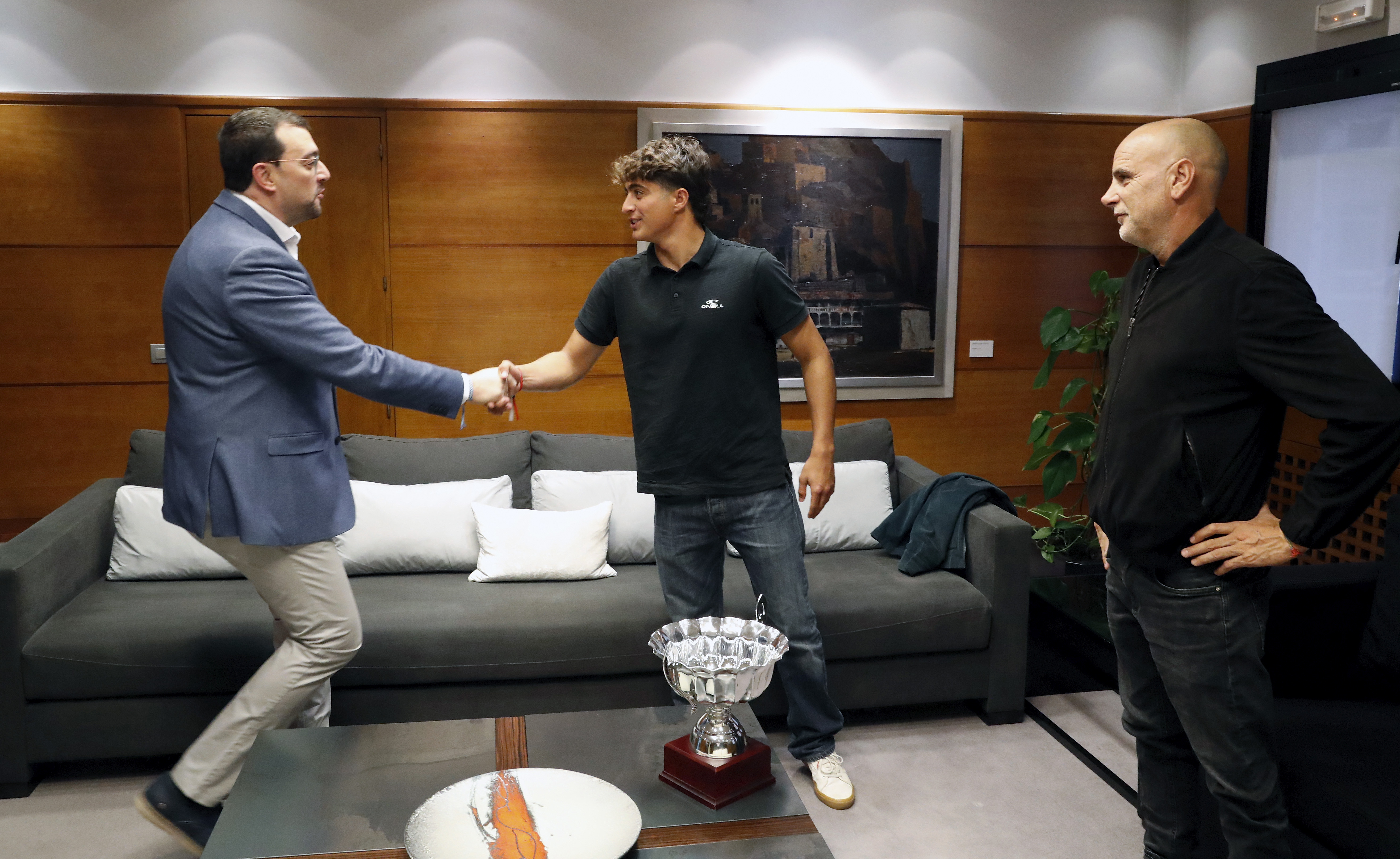 El presidente del Principado de Asturias, Adrián Barbón, ha recibido hoy al surfista Alfonso Suárez, campeón de Europa júnior (izqda.) y a su entrenador, Manuel Ruiz (dcha.).