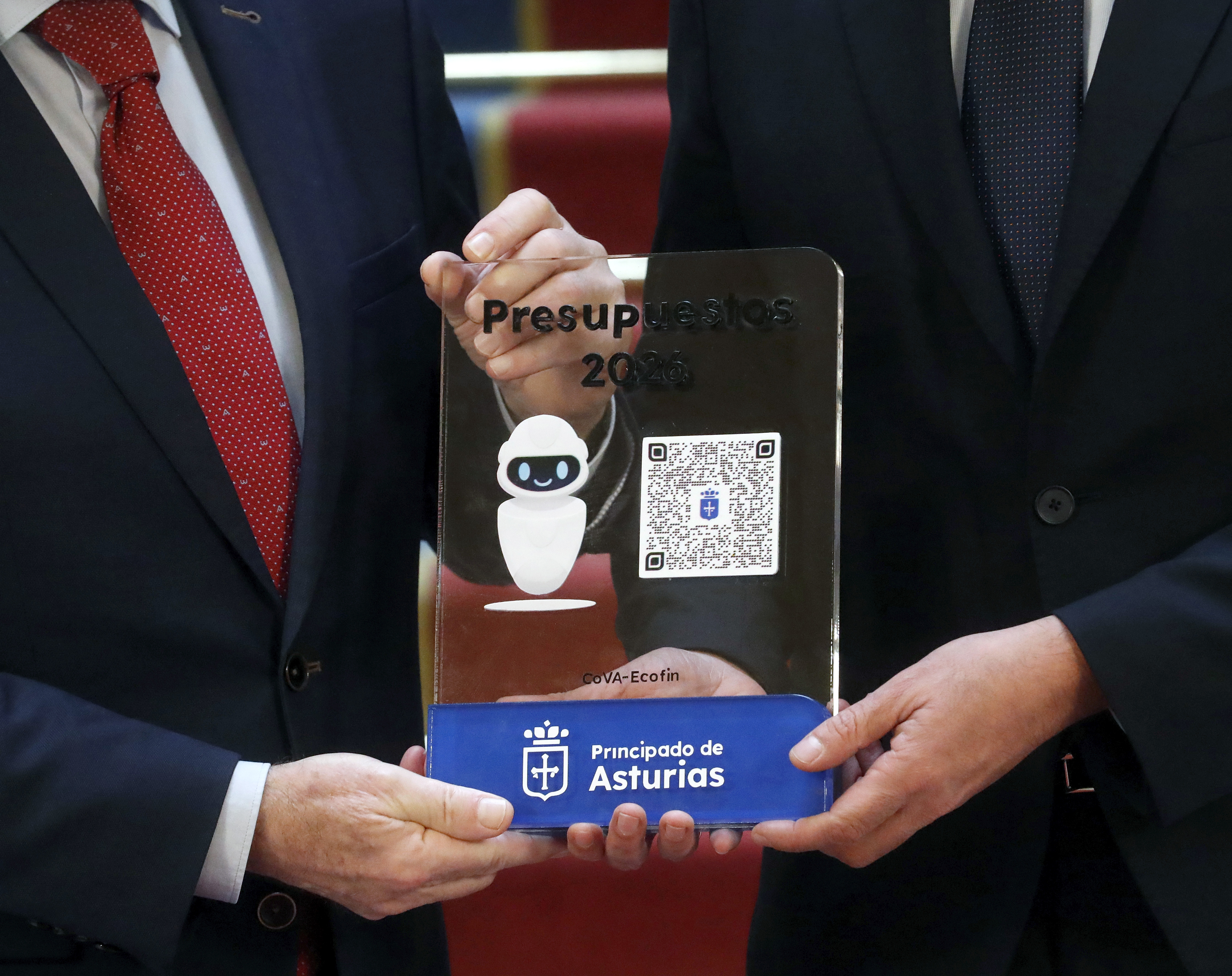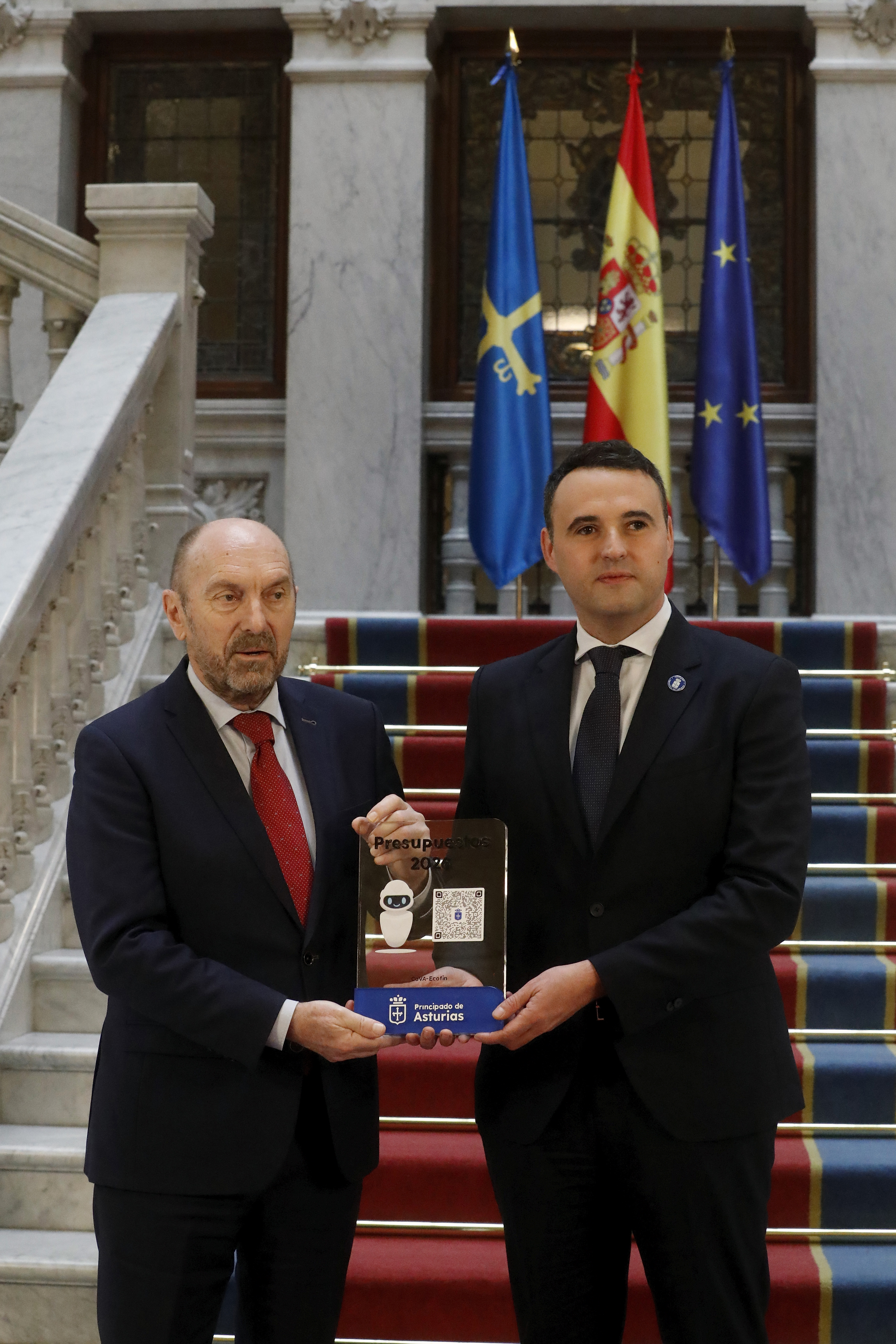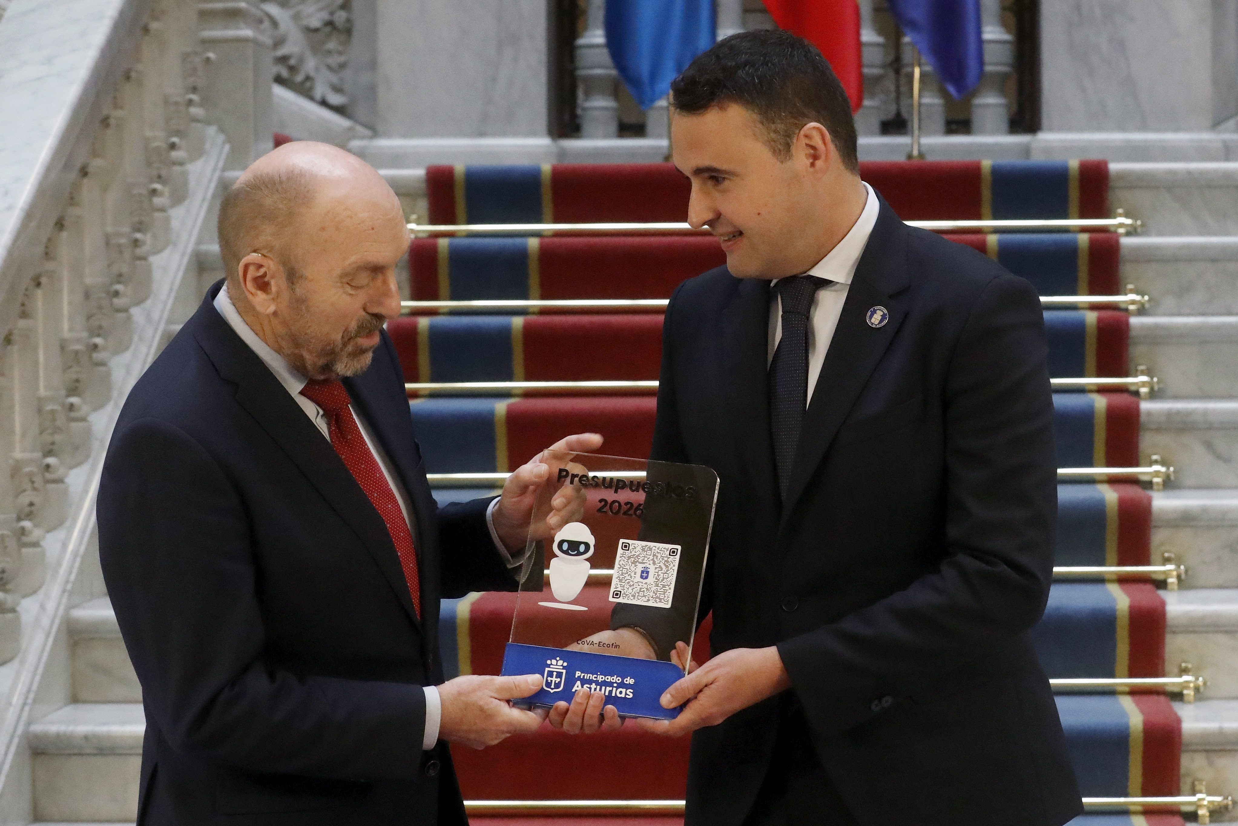 En la imagen, el consejero de Hacienda, Justicia y Asuntos Europeos, Guillermo Peláez (a la derecha), entrega al presidente de la Junta General, Juan Cofiño (a la izquierda), el proyecto de Prespuestos Generales del Principado para 2026.