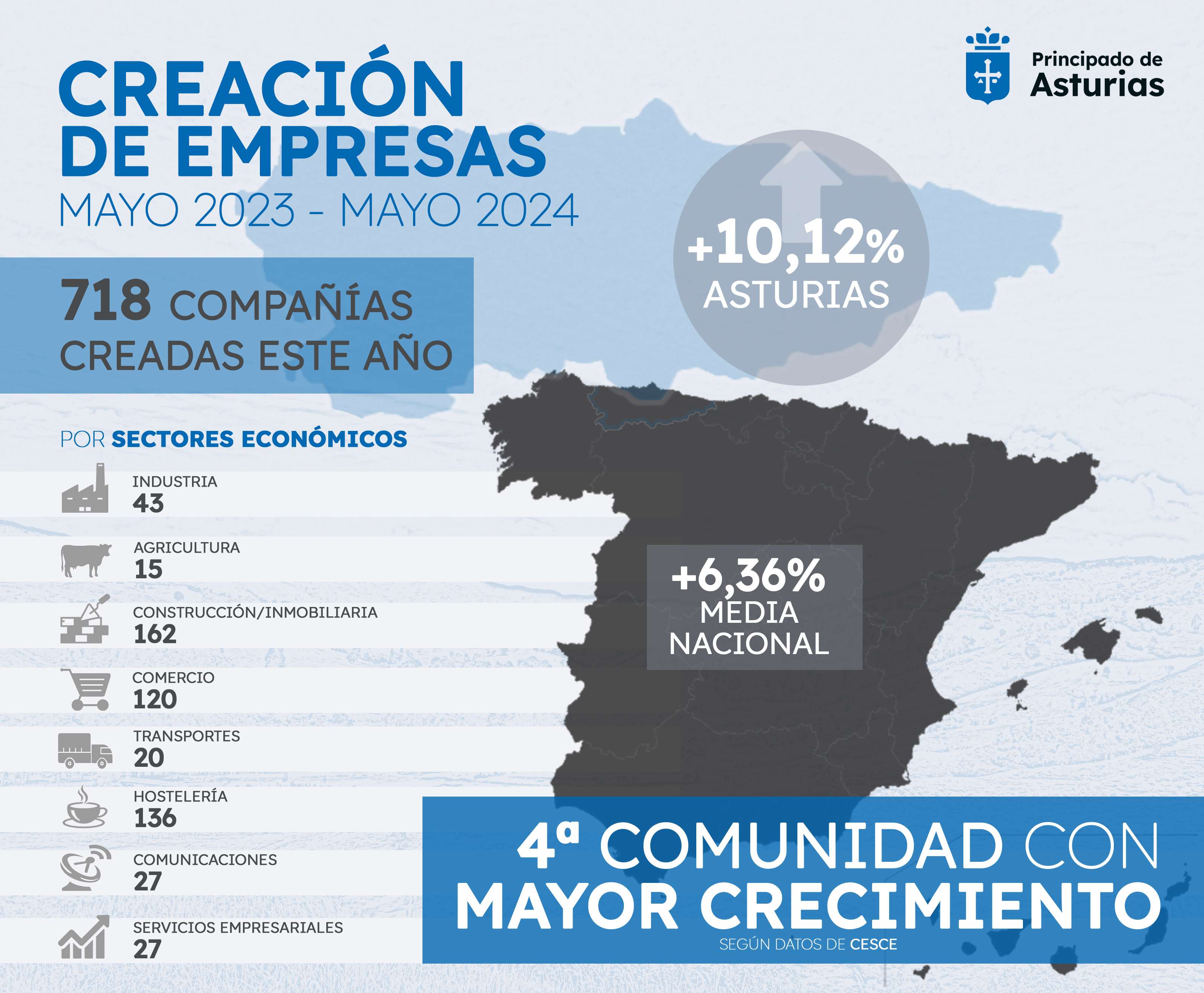 Asturias es una de las comunidades españolas en las que más está creciendo la creación de empresas, una clasificación que la comunidad ya encabezó el año pasado y que confirma el dinamismo económico del Principado. Entre enero y mayo de este año se crearon en la región 718 compañías, lo que supone un incremento del 10,12% en comparación con el mismo periodo del año anterior, según los datos que acaba de divulgar la compañía Cesce sobre la demografía empresarial.