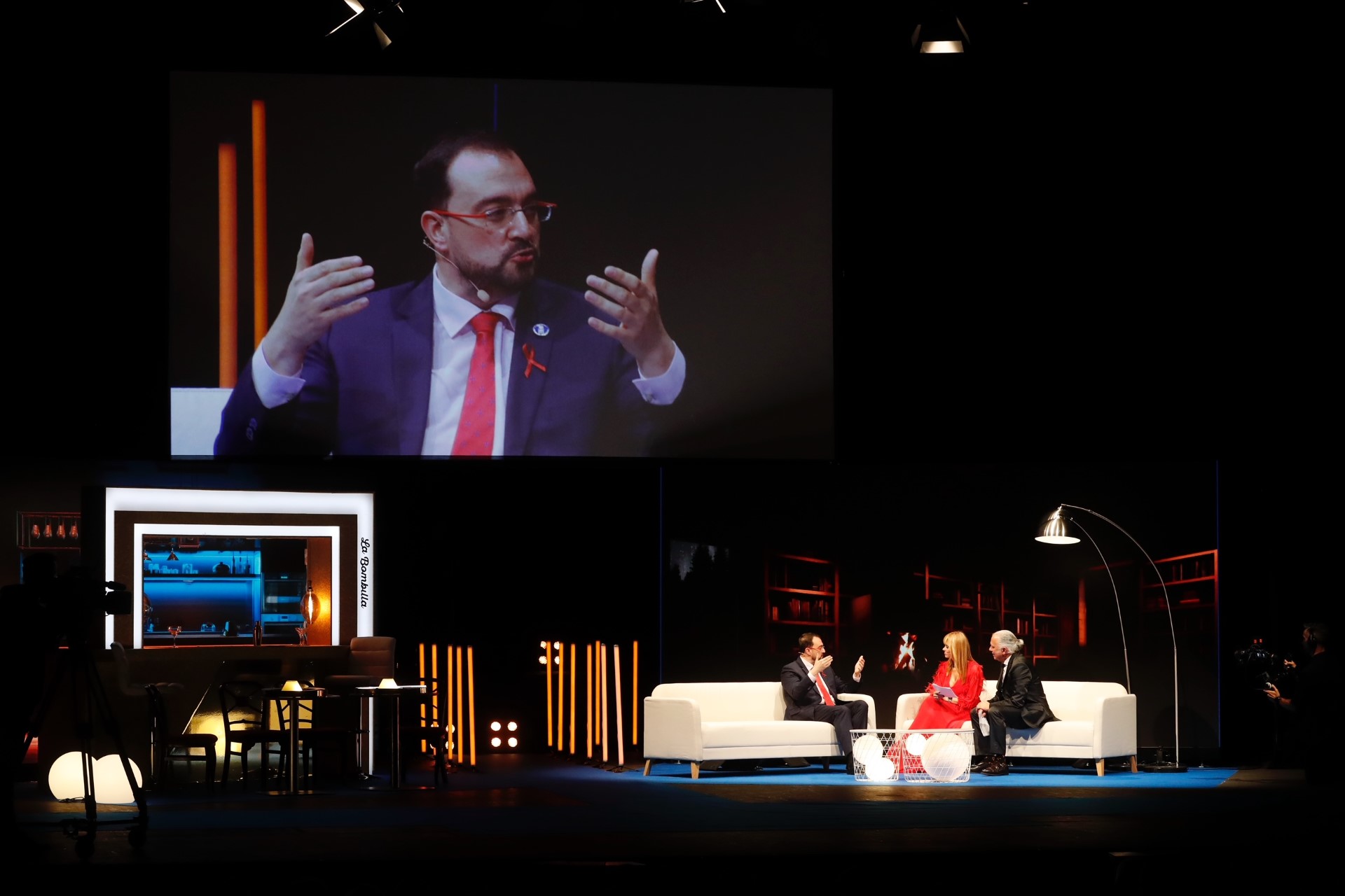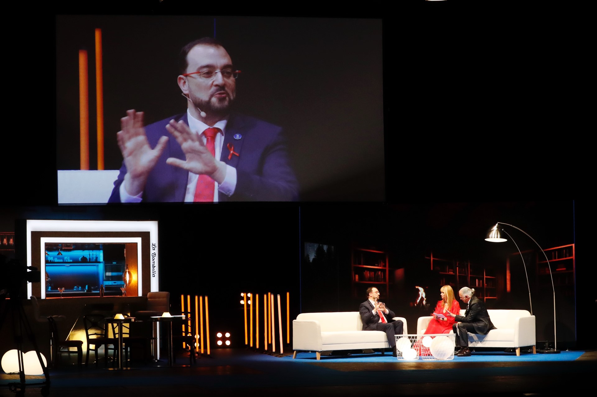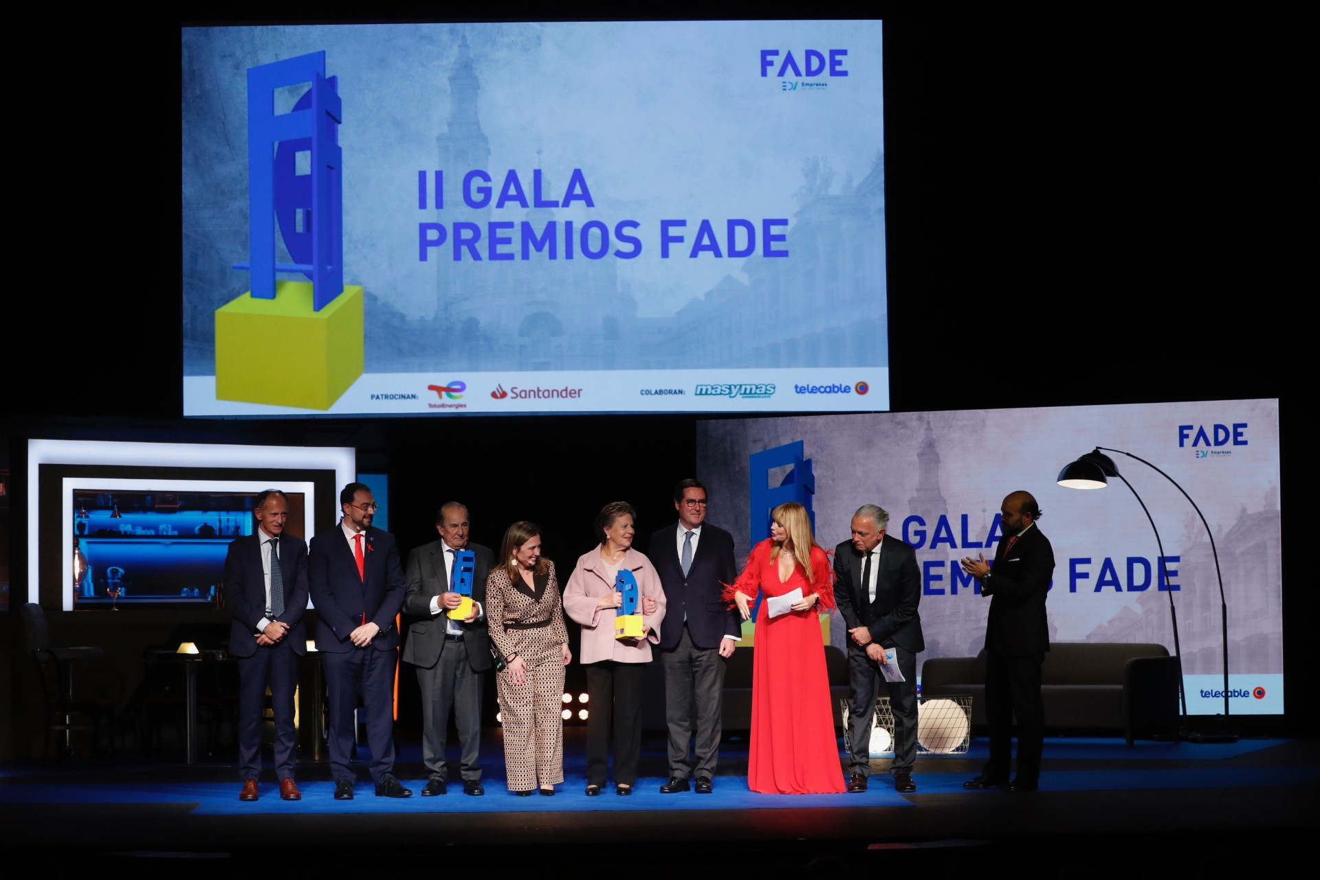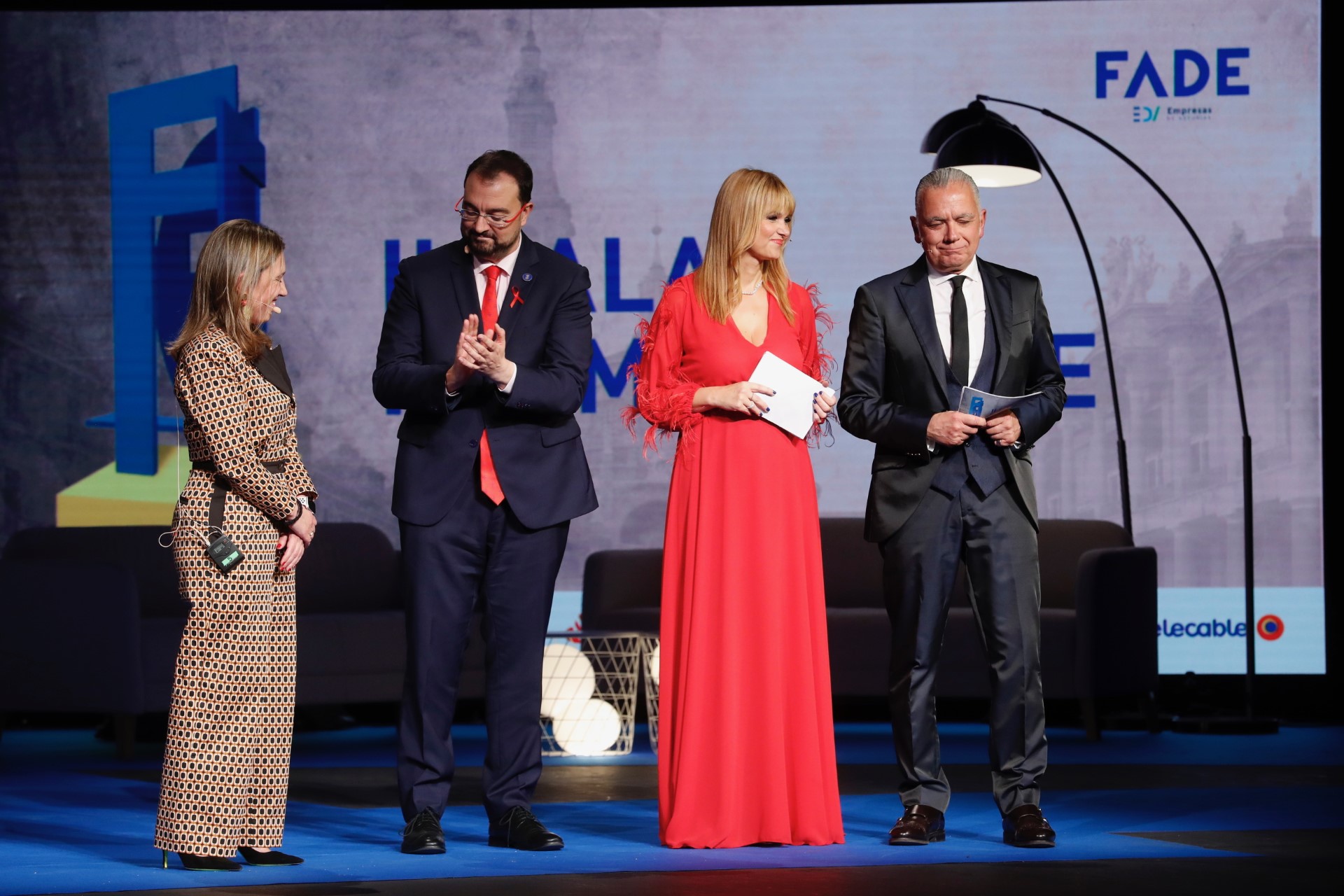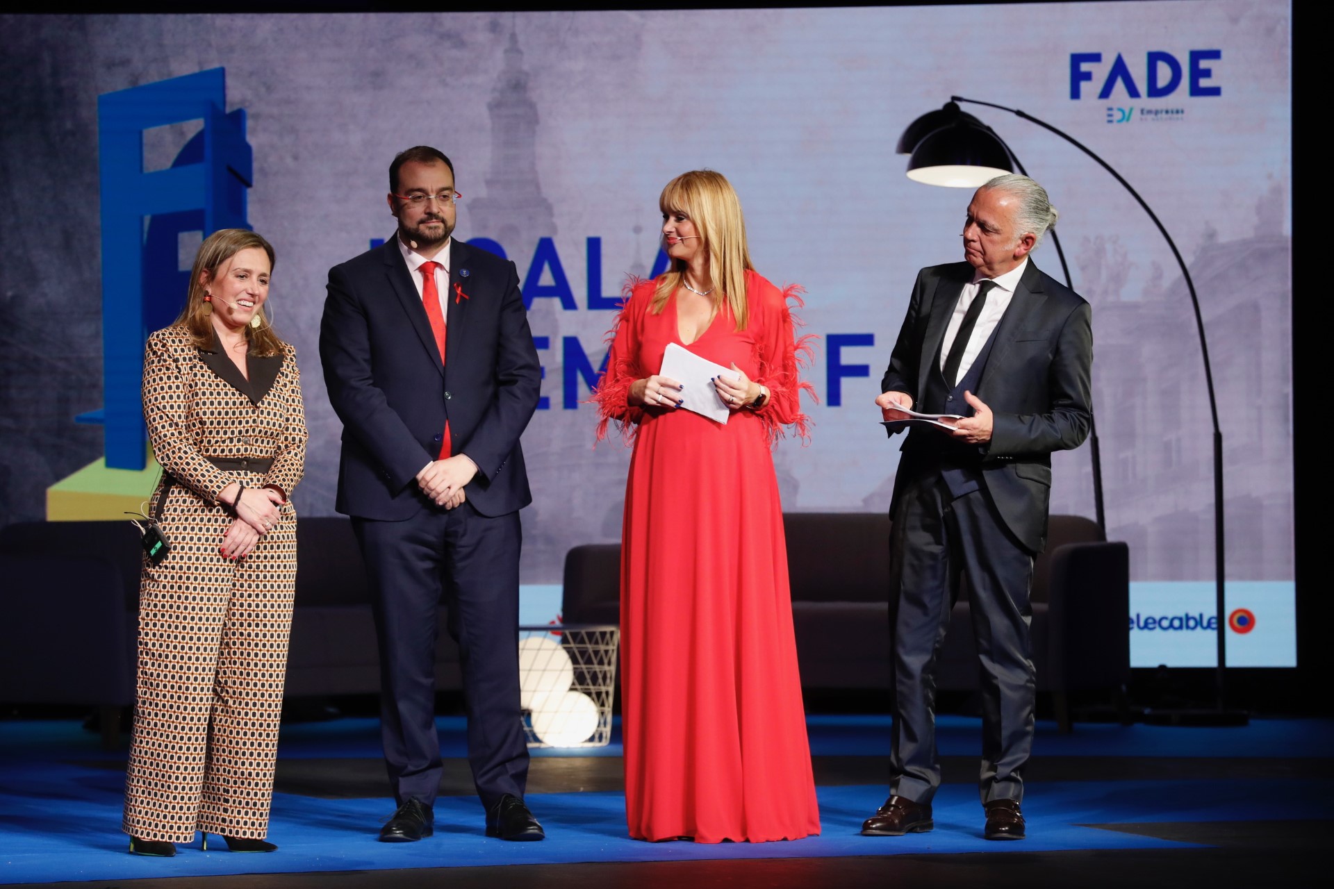 En la imagen (de izqda. a dcha.), la presidenta de Fade, María Calvo; el presidente del Principado de Asturias, Adrián Barbón, y los presentadores del acto, Sonia Pardo y Juan Ramón Lucas.