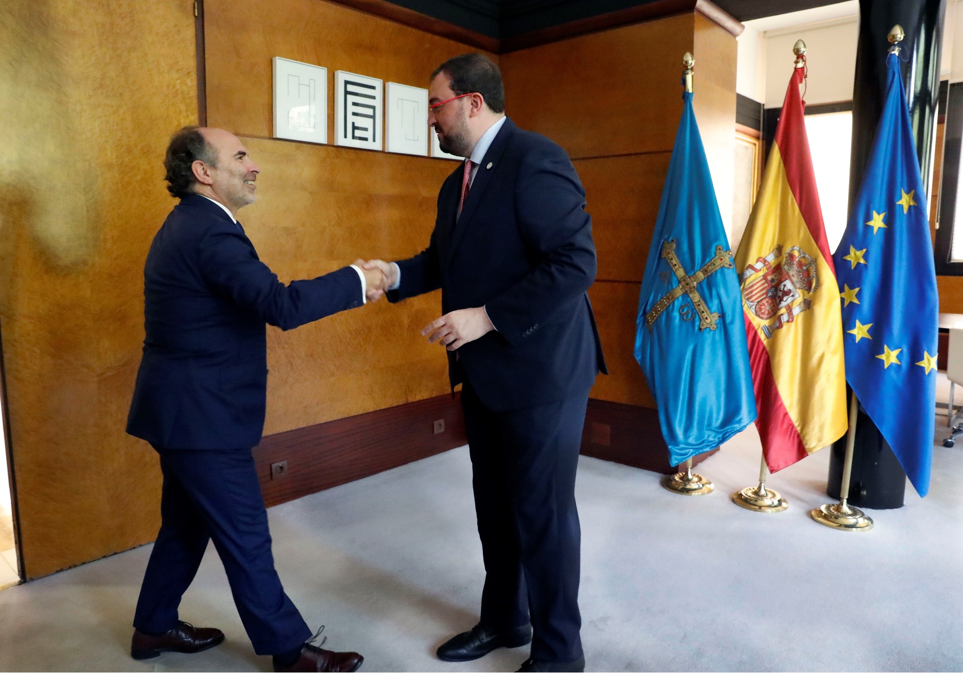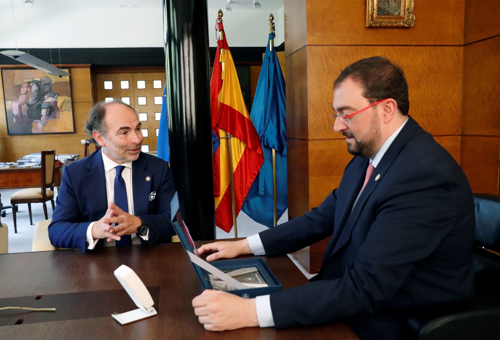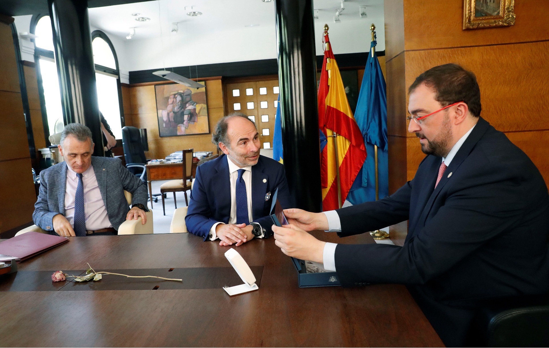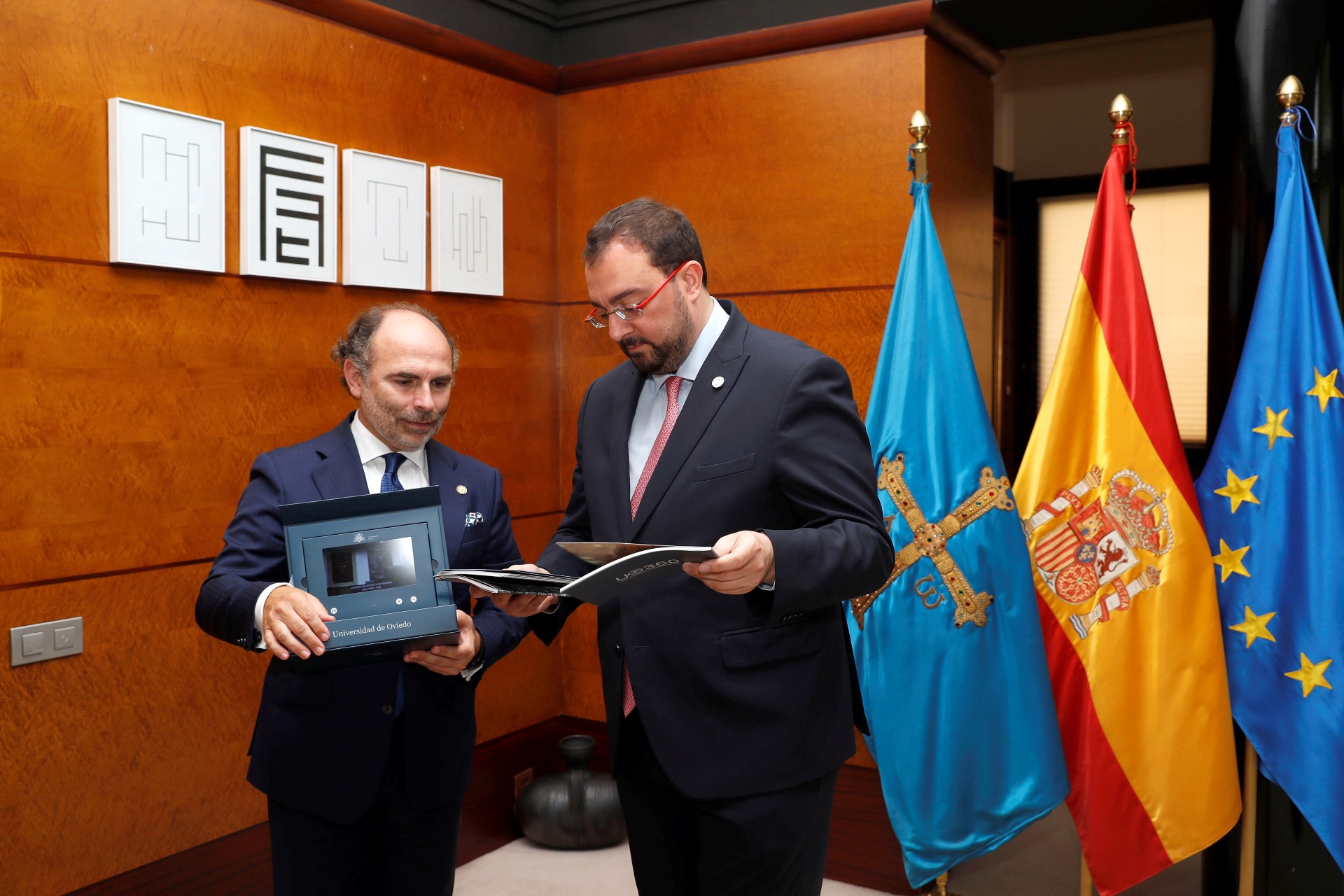 El gerente de la Universidad de Oviedo, José Antonio Díaz Lago; el presidente del Principado de Asturias, Adrián Barbón, y el rector de la Universidad de Oviedo, Ignacio Villaverde (de izquierda a derecha en la imagen.