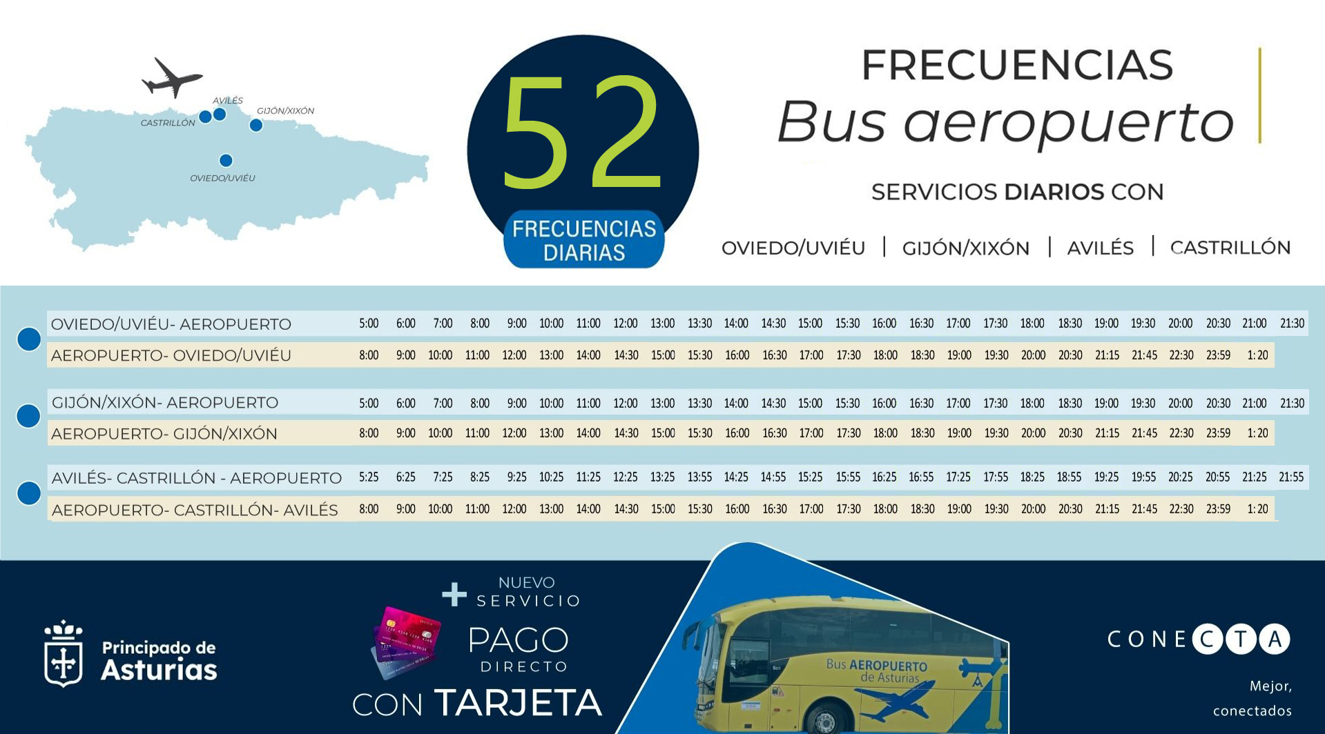 El servicio se refuerza este año con una nueva salida desde Oviedo/Uviéu y Gijón/Xixón a las 13:30 horas y desde Avilés a las 13:55. En sentido inverso se implanta una nueva conexión a las 14:30 horas. De esta manera, habrá un servicio disponible cada media hora para llegar al Aeropuerto de Asturias a partir de las 13:00 horas.