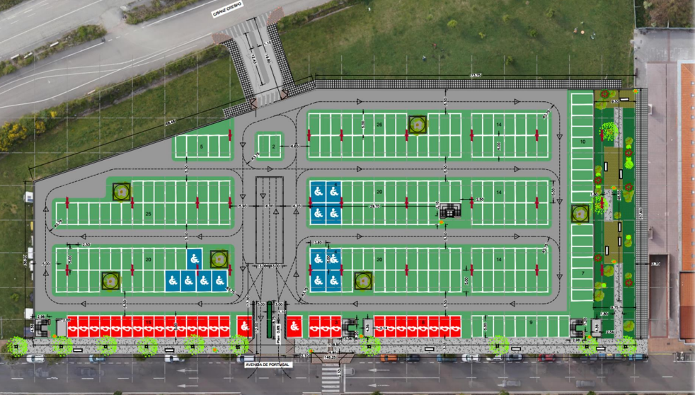 La planta cubierta contará con 230 plazas, diez de ellas adaptadas para personas con movilidad reducida y otras 26 equipadas con puntos de recarga para vehículos eléctricos. En la planta semisótano se ubicarán los 256 estacionamientos restantes. Todas las plazas adaptadas se han dispuesto en planta cubierta, cerca del acceso, y con salida directa y próxima a la calle. La planta semisótano tendrá un acceso por ascensor desde la avenida de Portugal, con el fin de garantizar su plena accesibilidad.