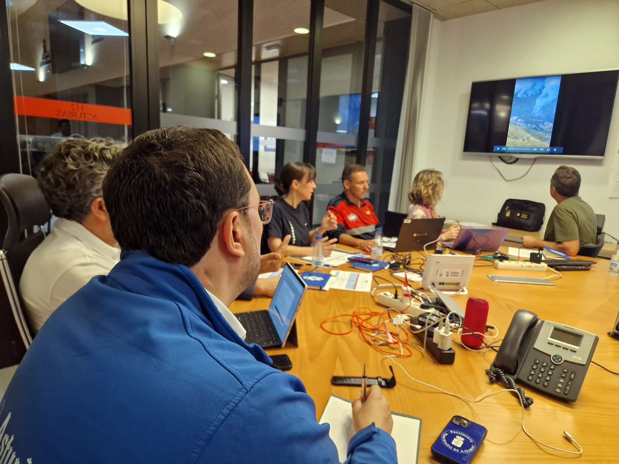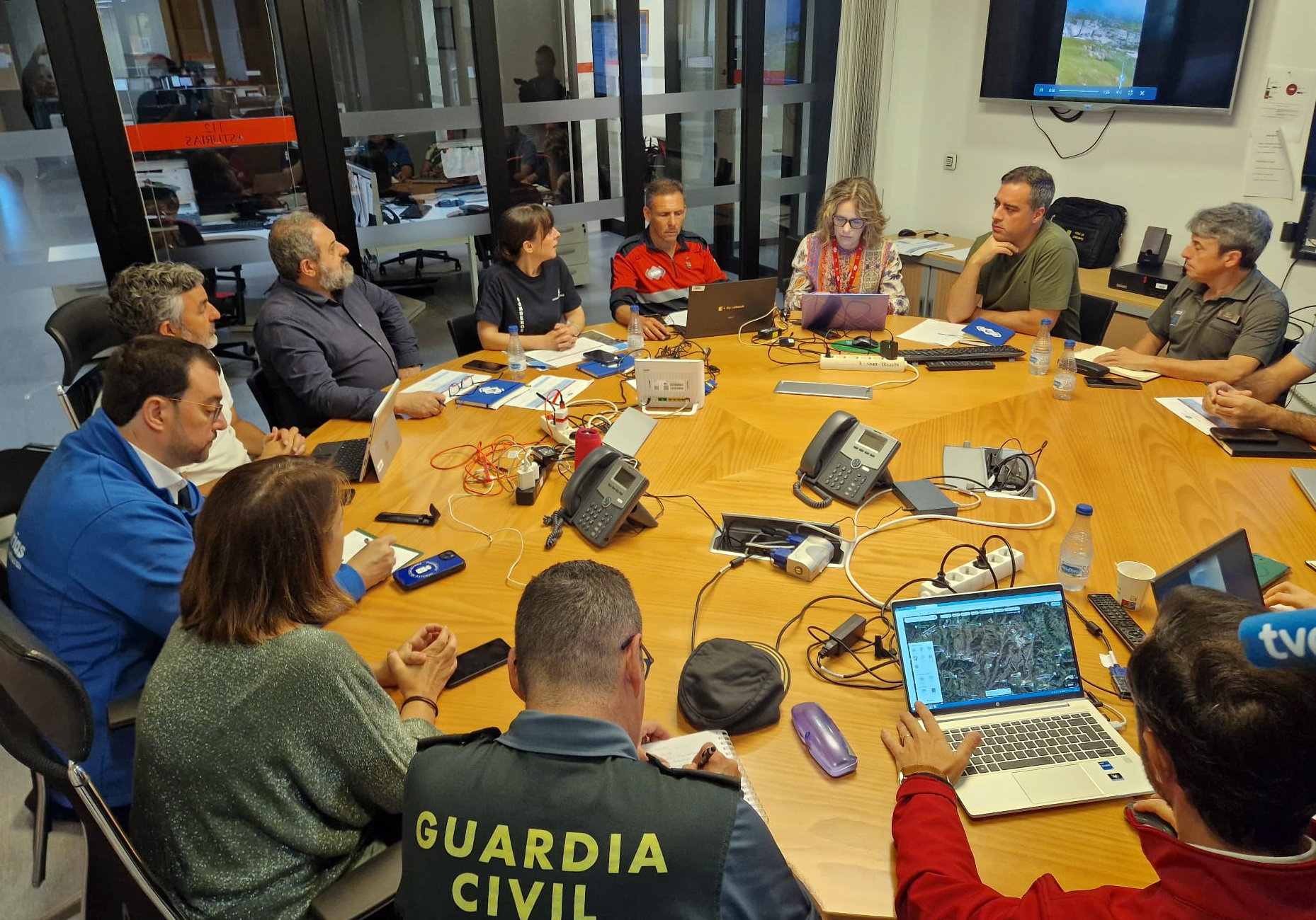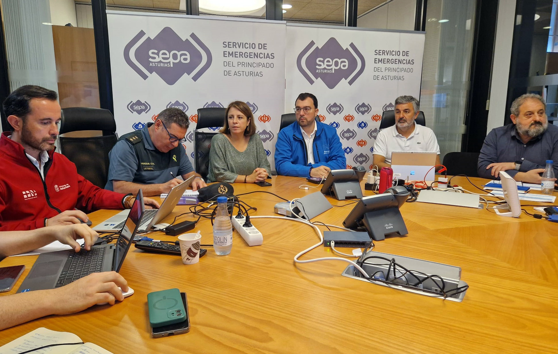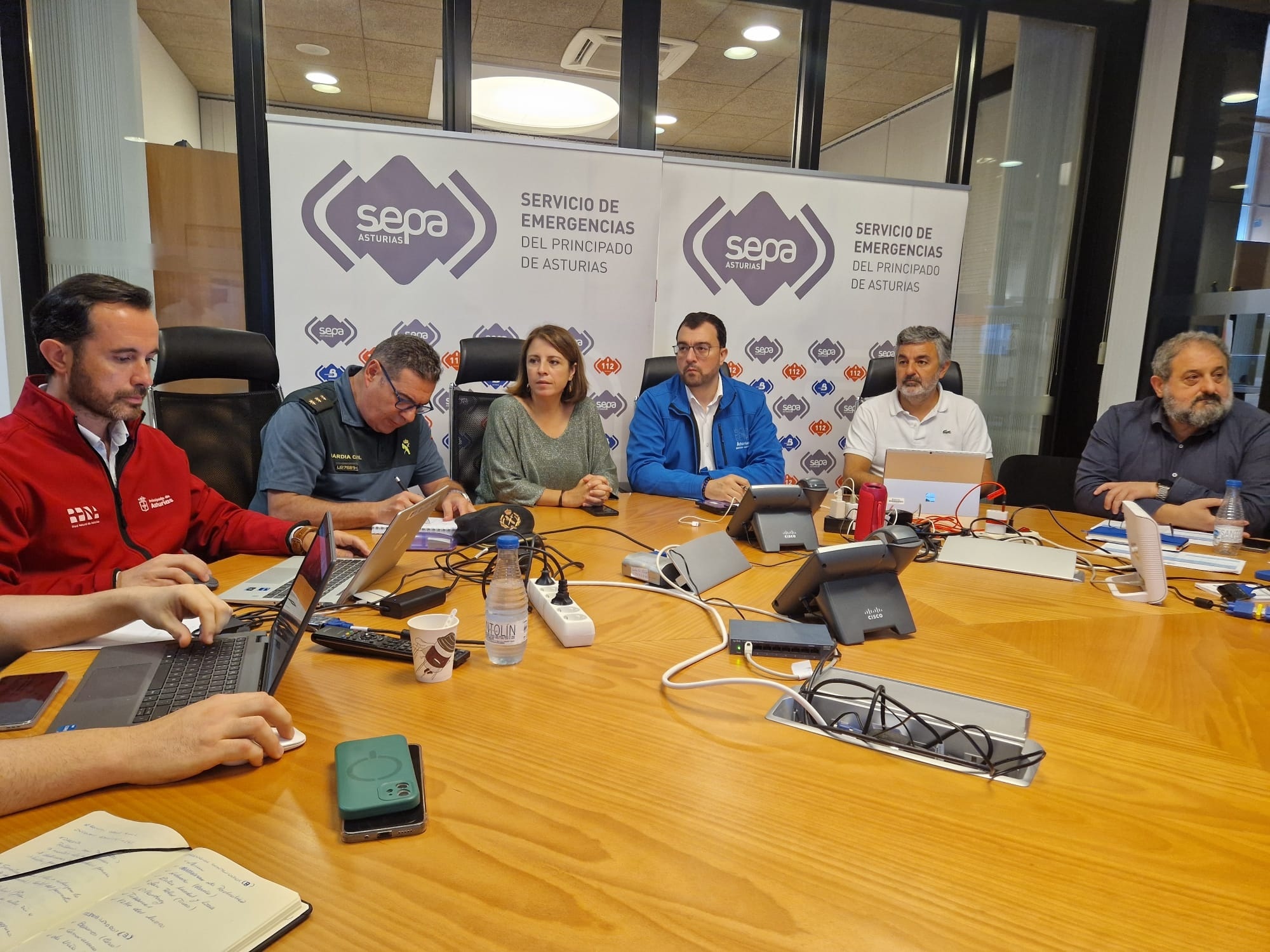 El presidente del Principado, Adrián Barbón, (segundo por la dcha.) ha participado hoy en La Morgal, en Llanera, en la reunión del Centro de Coordinación Operativa Integrado (Cecopi) que evalúa la evolución de los incendios forestales, junto al consejero de Gestión de Emergencias, Alejandro Calvo (a su izqda.) y la delegada del Gobierno, Adriana Lastra (a su dcha.).