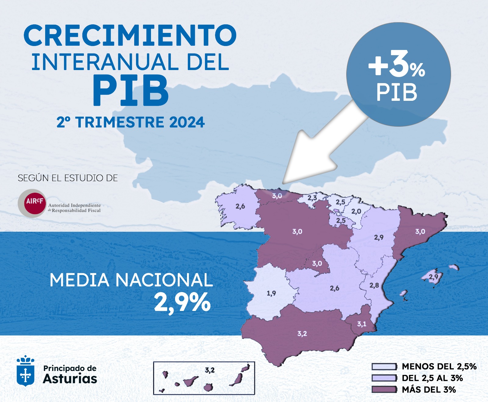 La economía asturiana experimentó un crecimiento del 3% durante el segundo trimestre del año en comparación con el mismo periodo del año anterior, según las estimaciones publicadas hoy por la Autoridad Independiente de Responsabilidad Fiscal (AIReF). Este porcentaje sitúa el ritmo de crecimiento del PIB de Asturias por encima del que registra la media nacional, que alcanzó el 2,9% en ese mismo período.